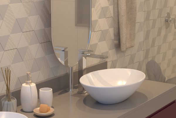 Sua bancada pode ser o elemento de destaque, com o uso de uma pedra translúcida, madeira ou porcelanato. Você pode fazer uma cuba esculpida, fazer uma grande bancada ou até escolher uma cuba diferente, como a cuba de piso, que é muito elegante.