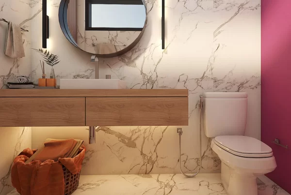 Nossa dica é usar peças de grandes dimensões, uma vez que assim possuímos menos rejunte, ou seja, menos junções na peça, garantindo maior facilidade na hora de higienizar e mais beleza e elegância.